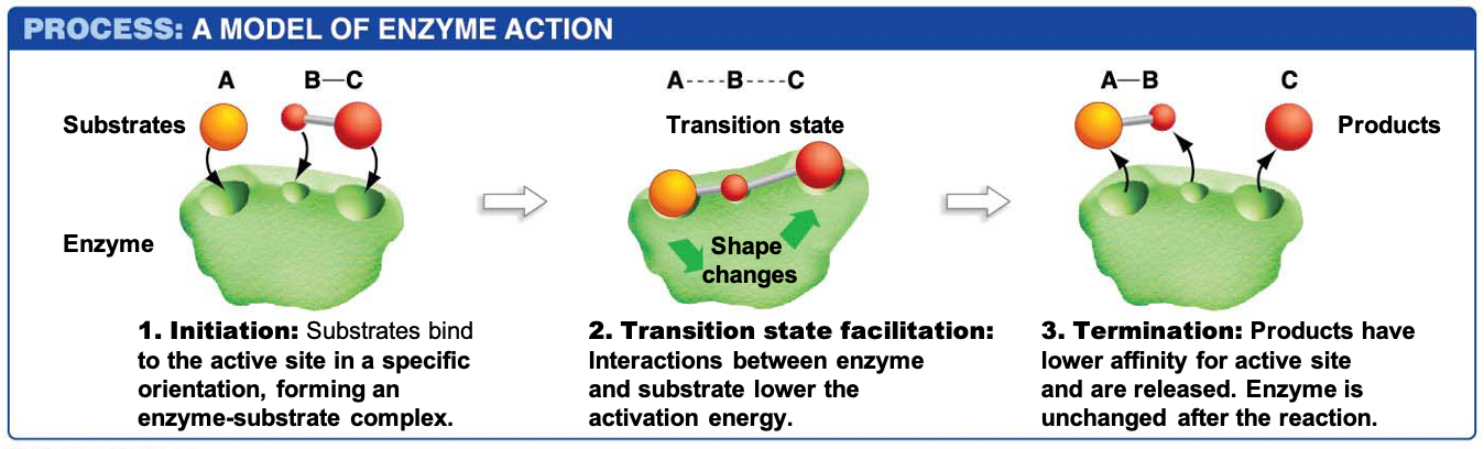 Enzymes are biological catalysts. Although some biological reactions happen spontaneously, the reactions are so slow that organisms require enzymes to speed them up. Like other proteins, the tertiary and quaternary shape plays an important role in enzymatic activity. This is because enzymes bind substrates in particular regions called the ‘active site’ of an enzyme. As the enzyme binds the substrates, it changes shape, bringing the substrates together. Additionally, enzymes stabilize the transition state, the unstable time period when bonds within the reactants are breaking but before the bonds in the products have formed. Stabilizing this transition state lowers the activation energy of the reaction, allowing it to proceed quickly. This model of how enzymes work is known as the ‘induced fit’ model (Figure 1).
